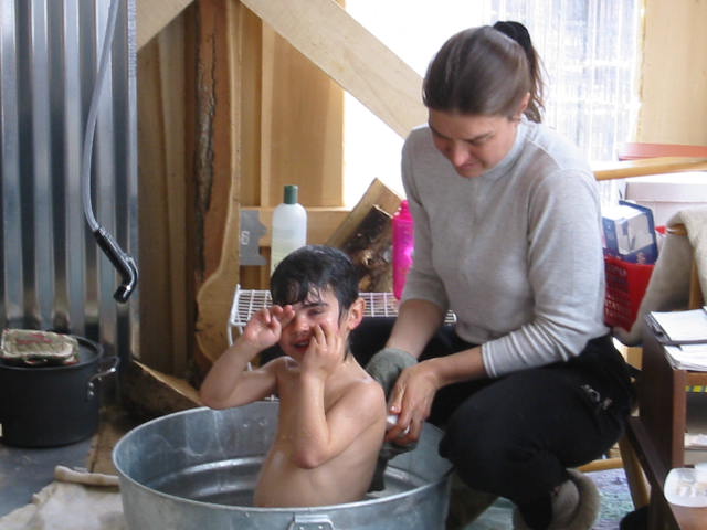 When my hair was dark brown – naturally. When my child was small enough to fit in a galvanized tub – which we needed because we had no indoor plumbing, running water or other such luxuries. When water was hauled in 5 gallon cans. When bath time meant warming up water on the wood stove or coleman camp stove and the shower consisted of a 5 gallon bucket with a spray hose attached. When having to go the bathroom at night in winter meant putting on boots and coats and trudging to the outhouse. But, oh what full moon on snow after midnight transcendent displays I sometimes saw! I can still so clearly see one such night when temps were in the teens, with a full moon alternating with fast moving storm clouds and the surrounding woods and clearings lit up by moon reflections off snow. It was simply stunning. No, this wasn’t a desire to return to the 1930’s. It wasn’t easy, nor was it hardship. It was means to an end, a life experiment, and to this day has made me so grateful for the warm water that comes out of the taps in my house, for the glories of enjoying plentiful hot water in a beautiful tiled indoor shower, for the comforts and ease that we often take so for granted…….And I suspect my son, who’s feet might not even fit in that galvanized tub these days is also happy for the same.